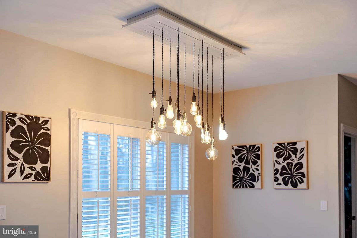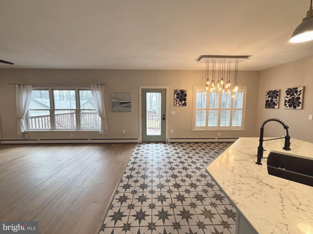 The heart of the home is the gourmet kitchen, featuring brand new cabinetry, granite countertops, and premium GE Café series appliances, including a range/oven combo, microwave, and refrigerator. The eat-in kitchen area is enhanced by elegant wood shutters, creating a warm and inviting space.