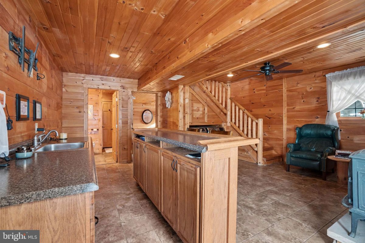 The lower level features a spacious entertainment room complete with a bar and wood burning stove—perfect for watching the big game—along with a guest bedroom. The main level showcases a large great room with two decks, offering ideal spaces for entertaining or just enjoying a peaceful day as the sun fills the space featuring a wood burning stone fireplace. The adjacent kitchen provides ample room for gatherings and flows seamlessly to the front porch, where rocking chairs frame a picturesque, peaceful view.