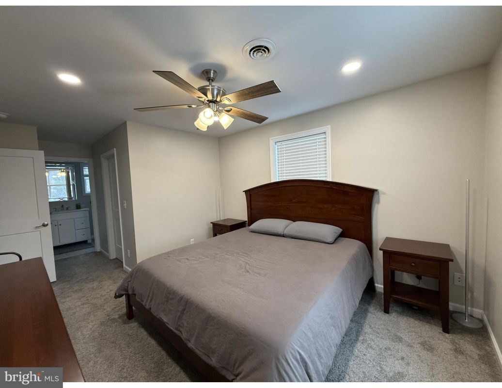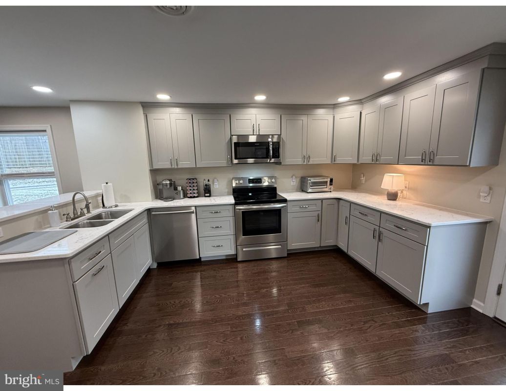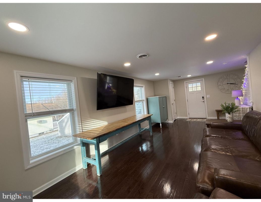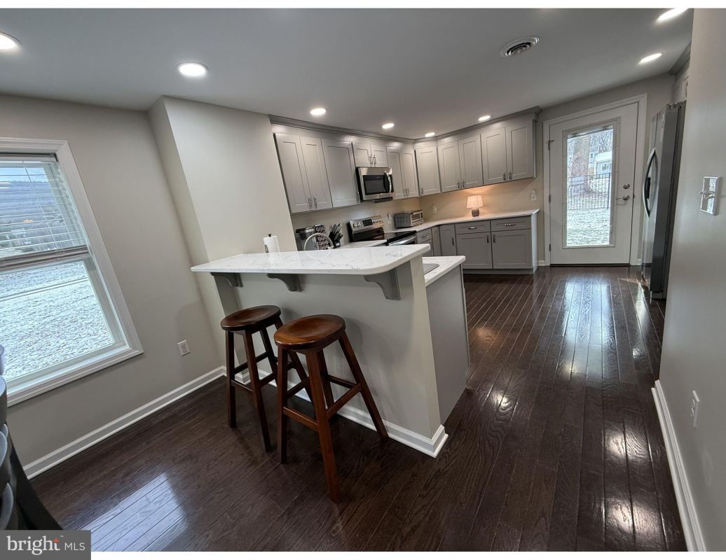 The main level offers an open-concept layout with hardwood floors and recessed lighting, creating a bright and inviting atmosphere. The 21’ x 11’ combined living and dining area provides generous space for everyday comfort and entertaining, while the kitchen boasts quartz countertops, a breakfast bar, soft-close cabinetry that offers abundant storage, and three-year-old appliances, including a Bosch dishwasher.