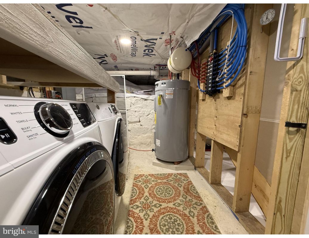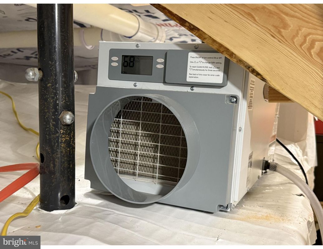 The basement has been upgraded for functionality and durability, with encapsulated walls and floors using a 90-mil thermal seal vapor barrier, a professional-grade dehumidifier with condensation pump, a new staircase, refinished floors, and a built-in workbench and laundry area ideal for storage or