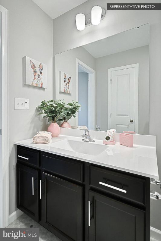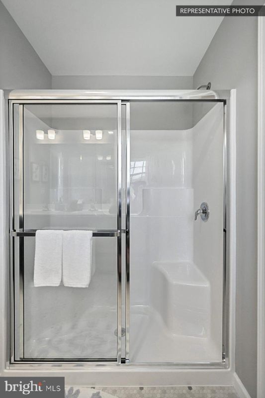 Upstairs, the primary suite includes a double‑bowl quartz vanity and a sliding framed shower door for a clean, upgraded finish (no tile). Secondary baths feature upgraded vanities/hardware and quartz tops. Additional highlights include island pendants, upgraded lighting in key areas, two‑tone interior paint, a media chase, and reinforced light fixture locations (ready for future fans).