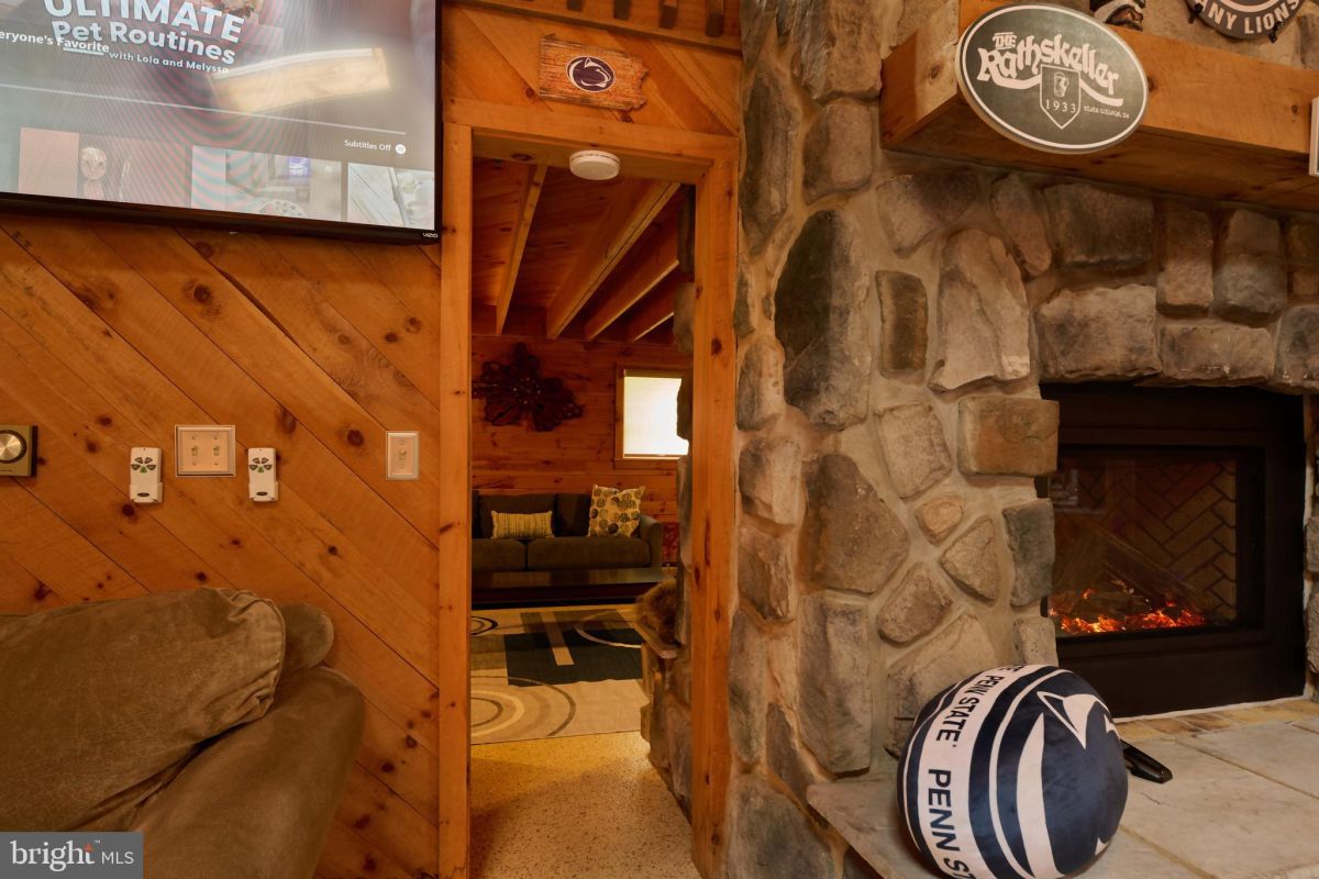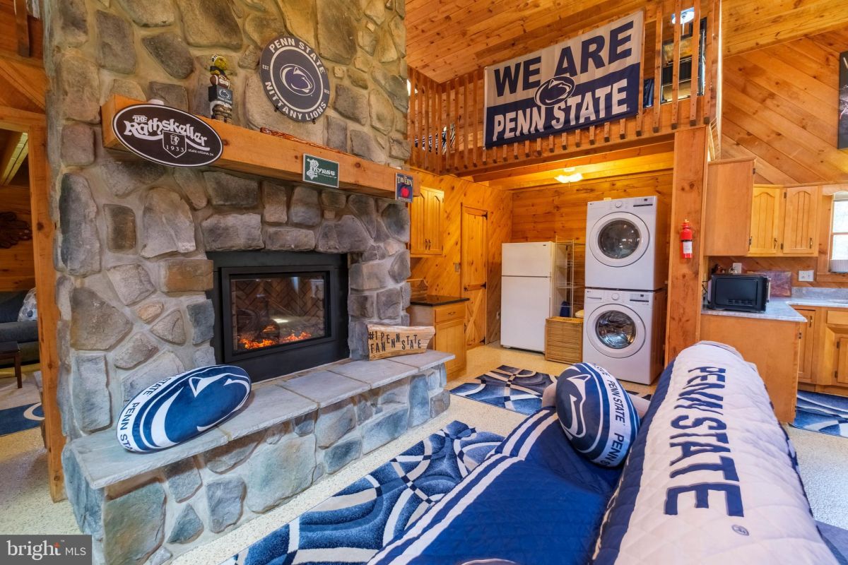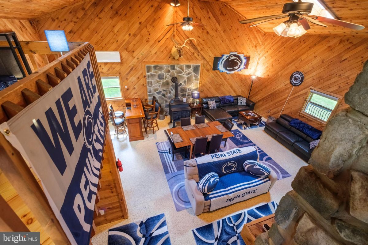 The cabin itself has been thoughtfully renovated over the past decade, blending rustic character with modern upgrades. The open-concept main living area features vaulted wood ceilings, skylights for natural light, and a stone fireplace that anchors the space. The kitchen includes updated finishes such as granite countertops and functional flow into dining and living areas—built for hosting after a day outside. A loft sleeping area expands capacity, making the property well-suited for group use, whether for Penn State football weekends or seasonal retreats.